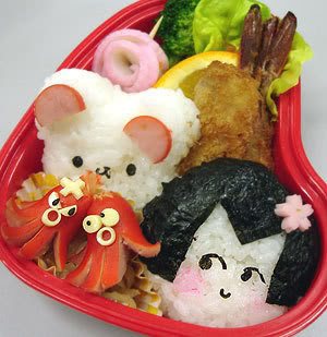 Emang Lucu banget kan, kalo makanan kayak gini cocoknya buat anak cewek yang feminim, cara bikinya juga kayaknya lebih mudah, nasi yang dibentuk kepala beruang, kepala cewek jepang, cumi2 yang dibuat dari sosis, beberapa shrimp dan sayur, udah deh ….